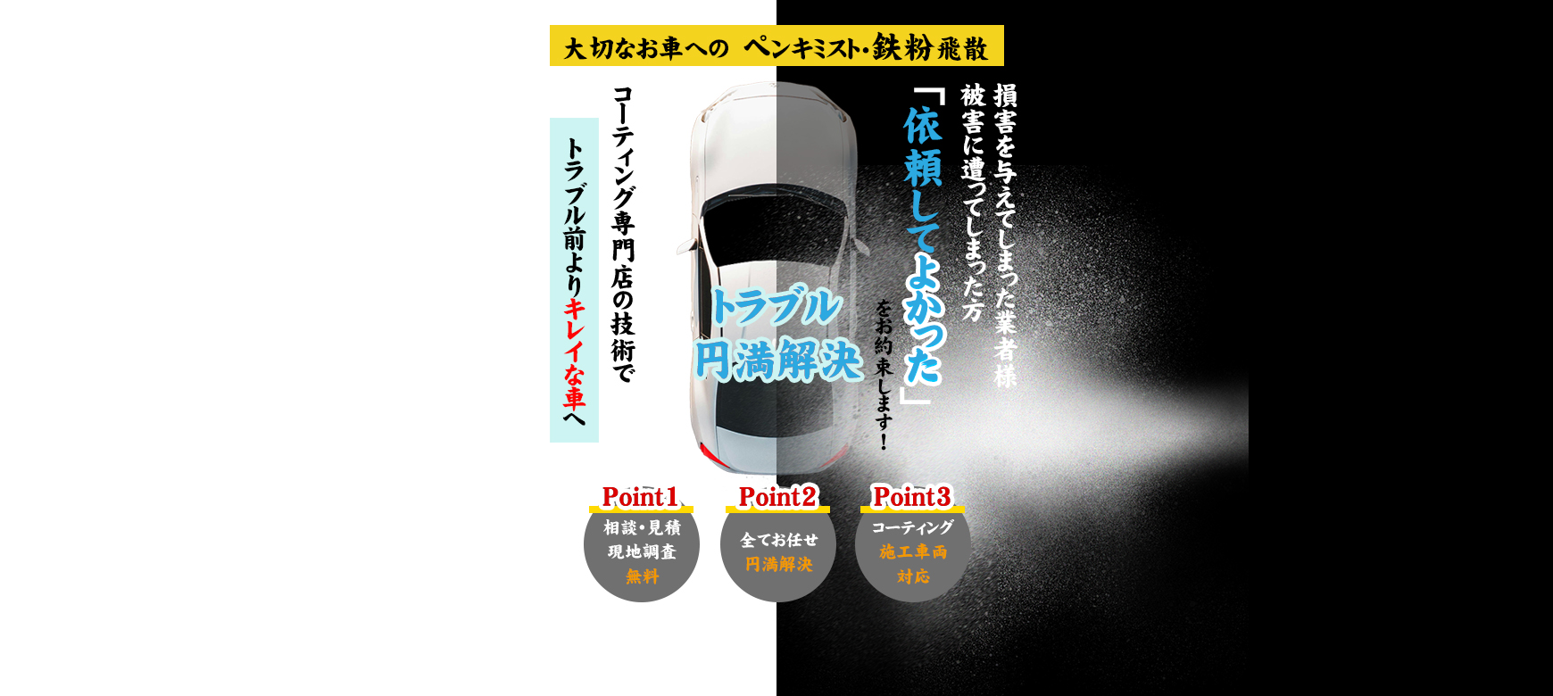 - 複数台ペンキミスト・鉄粉飛散被害を出してしまったので一度現場に来てほしい・・・